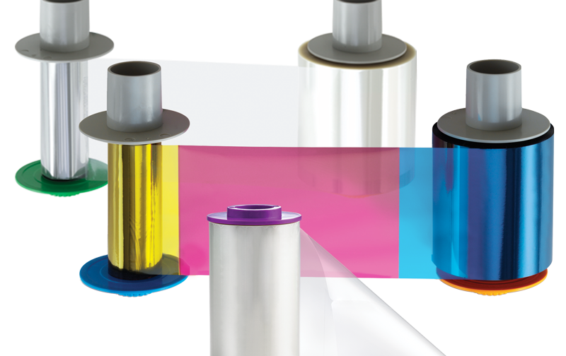 This ribbon is for a retransfer printer, which initially prints the image onto a film ribbon, then transfers the film onto the card. There is no overlay panel on the dye film ribbon. The transfer film acts as an overlay panel.